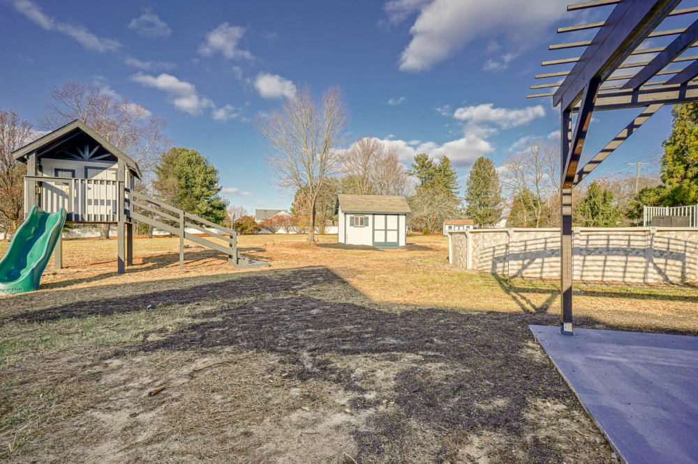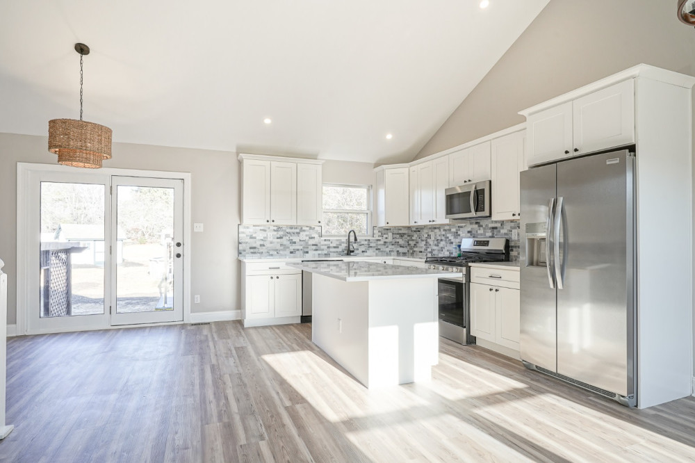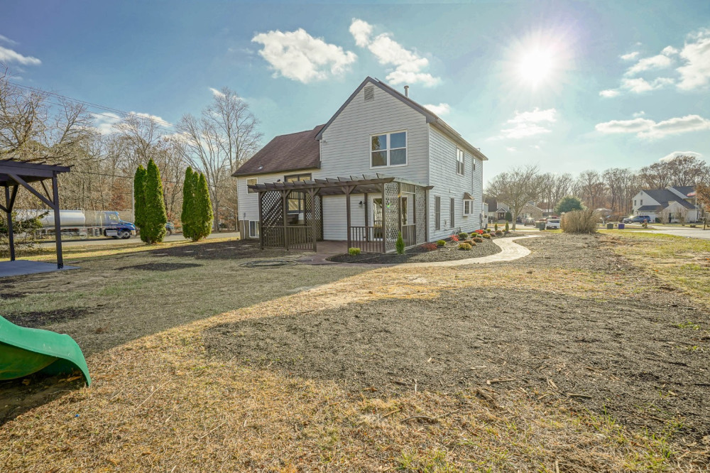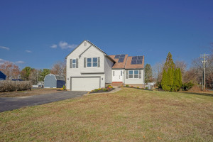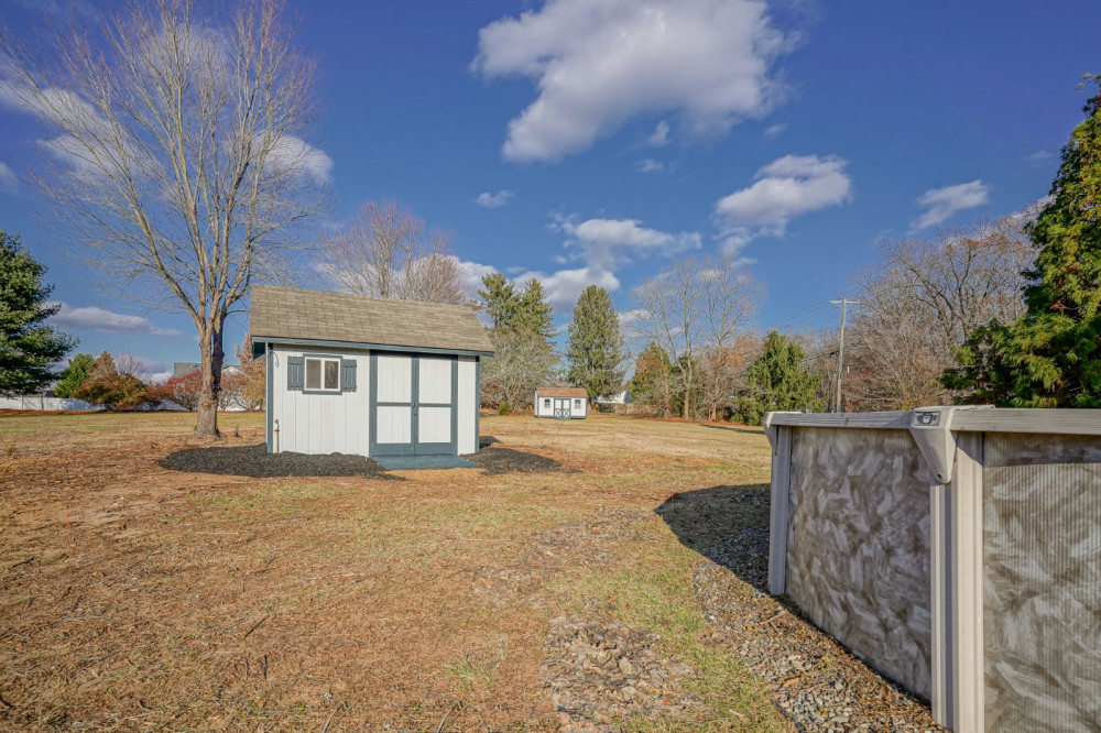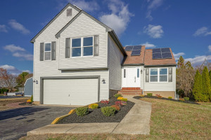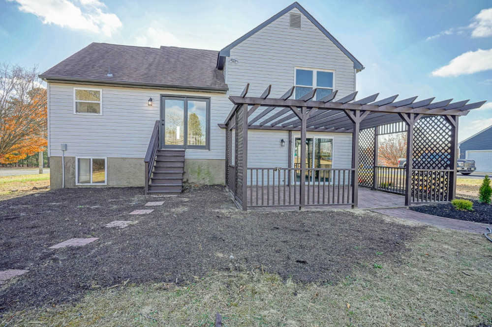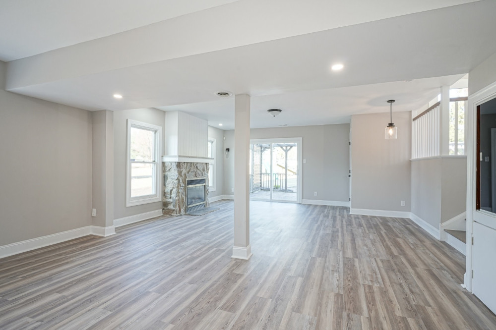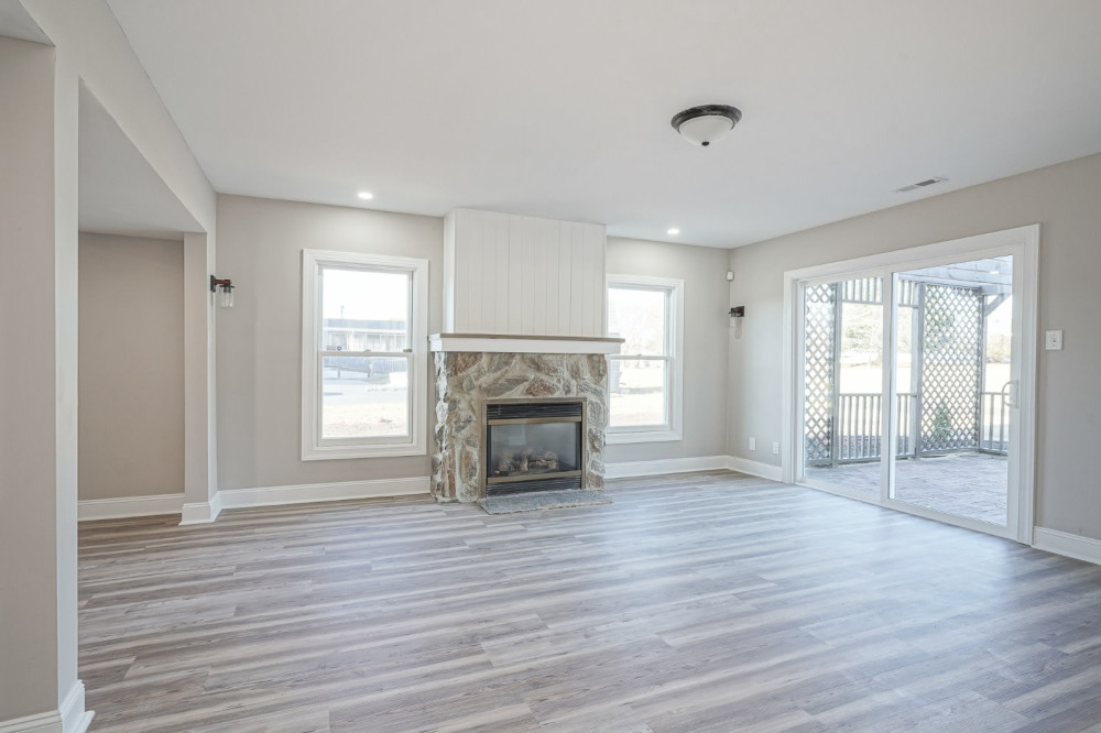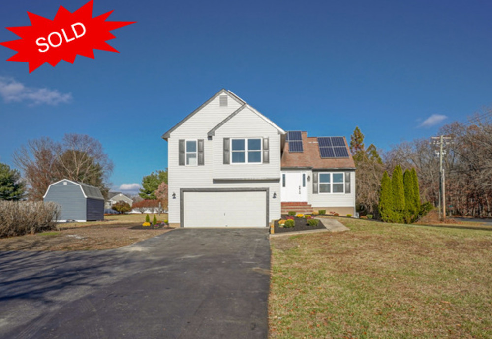 Prepare to be impressed! This spacious 3 bedroom, 2 bath home, situated on a 1 acre lot, has been completely renovated with today's most modern finishes! Enter to find engineered flooring throughout the main level featuring a gorgeous white kitchen with an abundance of cabinetry, granite center island, and stainless steel appliances. There is a living/dining area as well as a breakfast area, all light bright and neutral. There is also a door with access to the backyard A few steps down is the family room boasting a stone fireplace and access to the backyard patio and yard ideal for entertaining with above ground pool and plenty of space for activities! Down a few more stairs is additional finished space which can have many uses including gym, office, media or simply additional storage. Upstairs, the Primary Bedroom features architectural wooden beams and a sumptuous private bathroom with decorative tile flooring, oversized marble shower, and stunning double vanity. There are 2 additional generous sized bedrooms and a hall bathroom with custom tiled tub/shower combo and vanity. The laundry room is also conveniently located upstairs as well. Recessed lighting througout. Solar panels fully paid for and convey with the home